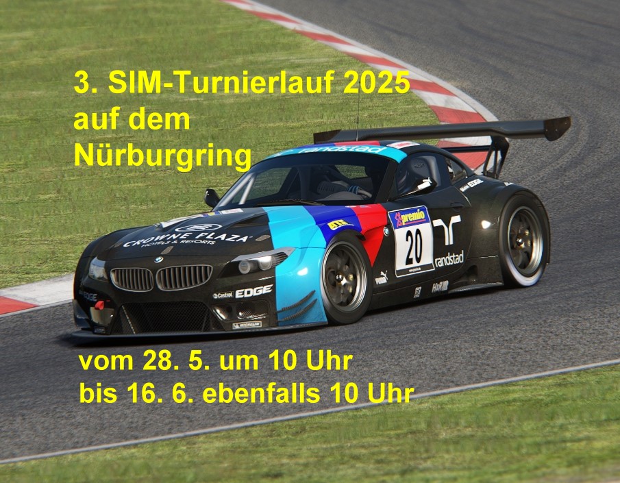 Am Mittwoch, dem 28. Mai um 10 Uhr startet unser dritter vereinsinterner SIM-Turnierlauf 2025. Wir fahren 14 Tage virtuell auf dem GP-Kurs des Nürburgrings. Wir hoffen, dass die Strecke den Teilnehmern wieder viel Spaß macht. Wer noch nicht genannt hat, kann das ja noch tun.